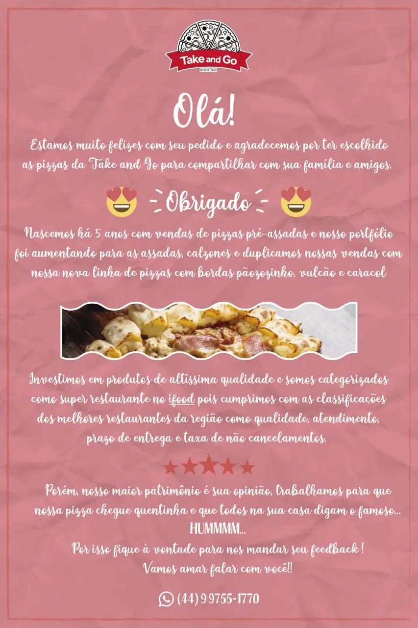 A pizzaria Rede Take and Go nasceu há 6 anos vendendo pizzas pré-assadas e notando a demanda por pizzas assadas resolveu mudar o mix de produtos e para se diferenciar da concorrência, optou em inovar num segmento já batido, onde o que muda de pizzaria para pizzaria é apenas o sabor e a massa da pizza. Para conquistar o WOW dos seus clientes, investiu em treinamento e inovação, criando em seu cardápio opções diferentes e muito saborosas.