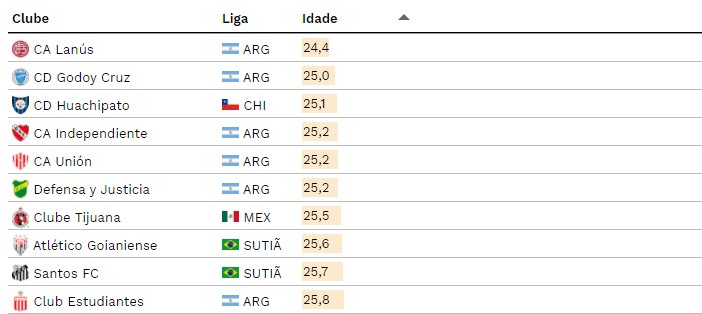 O clube com a idade média mais baixa é o Lanús, da Argentina, com 24,4 anos, Um clube chileno aparece somente na terceira posição: o Huachipato, com 25,1 anos. Já o mexicano melhor posicionado é o Tijuana, em 7º, com média de 25,5 anos, e finalmente os brasileiros Atlético Goianiense, com 25,6 anos, e o Santos, com 25,7 anos, representam o brasil na lista, ostentado a 8º e 9º colocação, respectivamente.