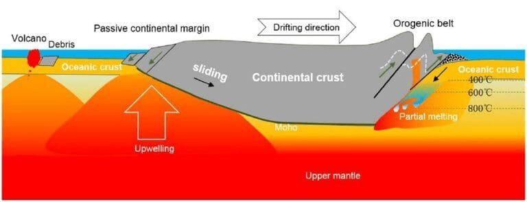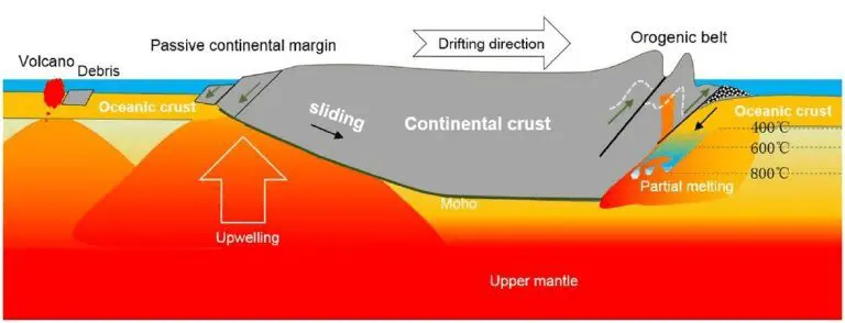 “A ressurgência do manto resultante leva a uma superfície inclinada de Moho, na qual a placa continental começa a deslizar, devido ao seu próprio peso,” explicou o professor Guanghe. “Esse movimento contínuo das placas continentais causa mais ressurgência do manto e inclinação da encosta de Moho, resultando na deriva da placa continental acima da placa oceânica.”