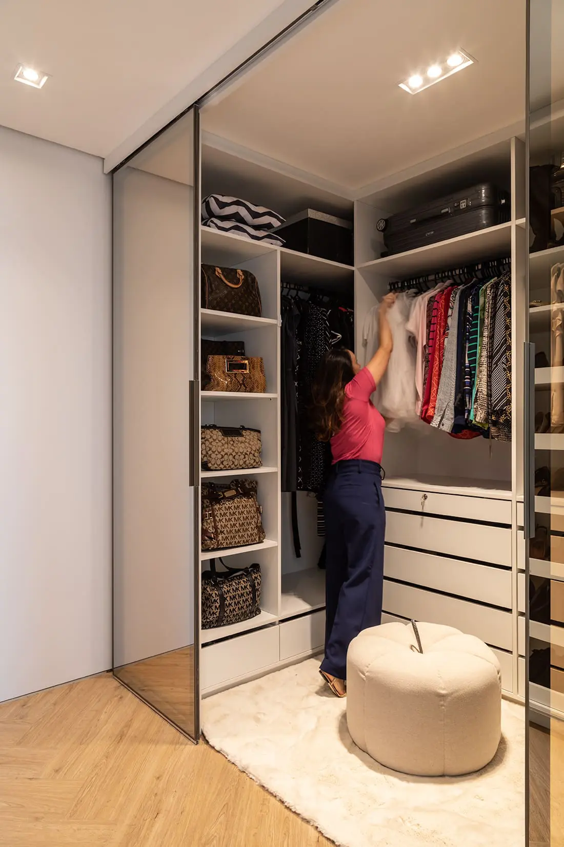 | Closet pequeno não é sinônimo de simplicidade: o projeto pode sim receber um toque de elegância e sofisticação em seu design: neste dormitório, Marina Carvalho adicionou elementos que valorizam o projeto, como as portas de vidro espelhado. Além disso, a distribuição de nichos e prateleiras propiciaram maior usabilidade no dia a dia dos moradores | Fotos: Evelyn Müller Um ótimo exemplo de aproveitamento de espaço é esse closet, de apenas 6 m², que foi planejado pela arquiteta Marina Carvalho dentro de um dormitório de casal. Sem portas nos nichos e prateleiras, a estrutura com tudo à mostra simplifica a visualização das peças. Porém, é possível fechá-lo devido à instalação das folhas de correr com vidro translúcido, que tem o papel de isolar o ambiente sem totalmente desconectá-lo do ambiente. Por se tratar de um espaço fechado, a iluminação, além de necessária, é um dos pontos fortes desse closet. Outro ponto a ser exaltado é o conforto: dentro dele, o tapete gostoso para ficar descalço e o pufe tornam o momento do vestir ainda mais prazeroso. 4) Closet aliado à marcenaria A marcenaria é uma grande aliada para compactar o espaço e proporcionar organização. Neste closet projetado pela arquiteta Cristiane Schiavoni, cada peça fica no seu devido lugar| Fotos: Evelyn Müller A arquiteta Cristiane Schiavoni, à frente do escritório que leva o seu nome, também possui, em seus projetos, closets compactos e práticos. No caso deste espaço, ela priorizou a organização – premissa que não pode faltar nesses projetos. Para que tudo ficasse bem-organizado, a solução foi investir na execução de uma marcenaria que abriu espaços certinhos para cada necessidade. Com modulações de alturas diferentes de cabideiros que combinam com o estilo de roupas usadas pelos moradores, o closet contempla ainda nichos para acessórios, gavetas para as peças menores e até mesmo uma penteadeira. “A contratação de um profissional de arquitetura é muito importante nestes casos, pois com a nossa concepção, fica mais fácil não ter a bagunça tão ‘normal’ em closets e guarda-roupas“, alerta Cristiane. 5) Sapateira no hall de entrada |