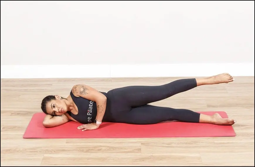 Deitado de lado em linha reta, braço de baixo flexionado sob a cabeça, mantenha a perna de baixo estendida e apoiada no solo e a perna de cima alinhada com o quadril.