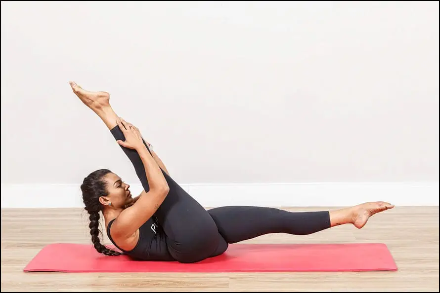 Deitado de costas, ombros e escápulas elevados do solo, queixo em direção ao peito, eleve uma perna para cima e segure pelo tornozelo mantendo-a estendida, enquanto a outra está paralela ao solo. Levemente troque a perna sem movimentar o tronco.