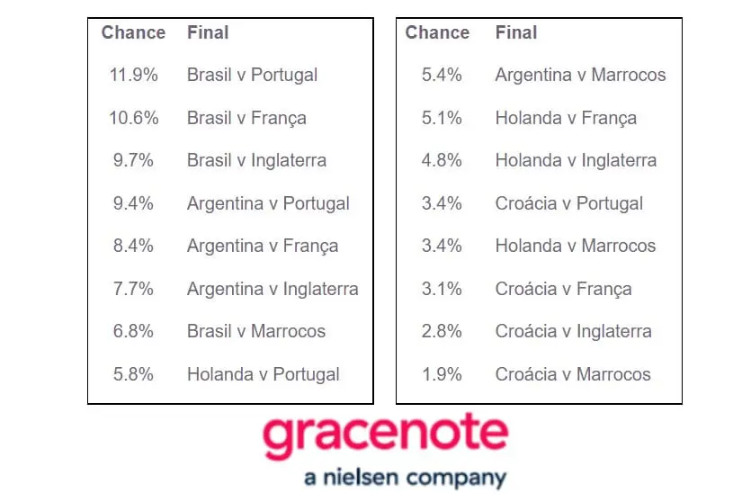 Restam apenas 16 possíveis finais da Copa do Mundo nesta fase. O mais provável é Brasil x Portugal, que tem apenas 11,9% de chance de acontecer. É seguido por Brasil x França (10,6%), Brasil x Inglaterra (9,7%) e Argentina x Portugal (9,4%). Estas são as únicas finais atualmente com pelo menos 9% de chance de acontecer.