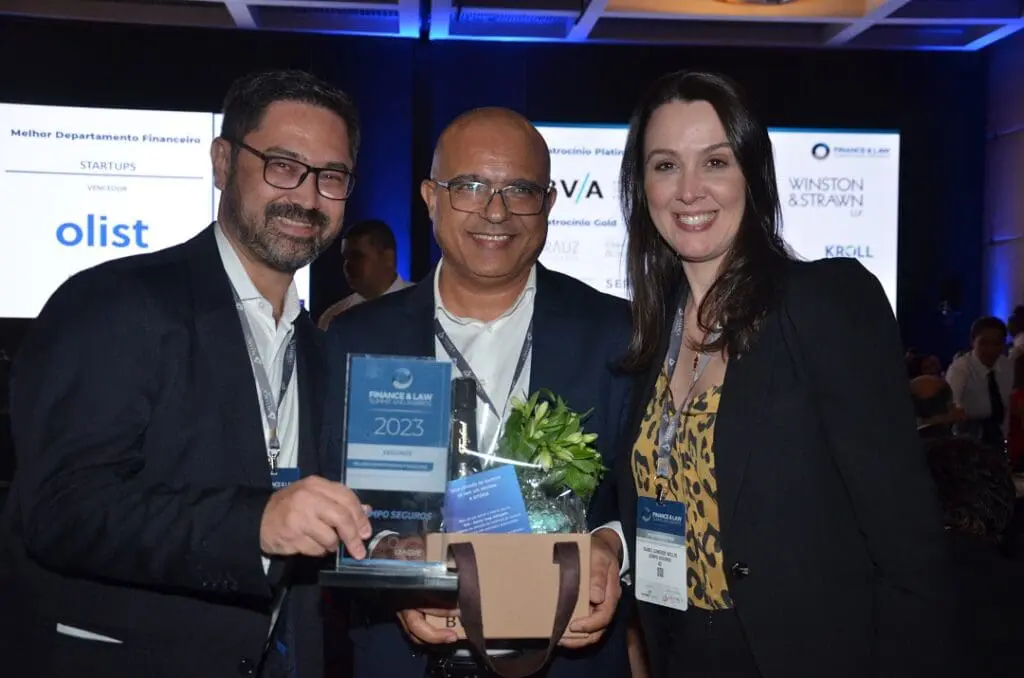 (ao centro) Marco Aurélio do Santos, que recebeu o prêmio de Melhor Departamento Financeiro em Seguros em nome da Sompo Seguros, ladeado por Claudio Augusto Vaz e Isabel Cândido Willig, do Departamento Jurídico da companhia.