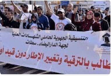 Conforme os dados dos 17 comités de coordenação da greve nacional, os professores e instituições de ensino no Marrocos paralisam o setor do ensino público, os discentes, o governo e o conselho da educação continuam sob uma nova onda de pressão, numa altura em que 90 %, dos professores exigem uma inserção direta na função pública, e troca do acordo contratual.