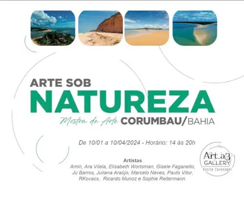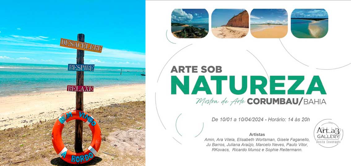 A curadora e empresária Rosita Cavenaghi organiza em Corumbau na Bahia, uma exposição inédita que foca nas relações entre arte e natureza. Neste paraíso, em uma das praias mais bonitas e sossegadas do Brasil, cuja extensão é de 3 km sendo permanentemente deserta, a curadora conta que a exposição coletiva se dará na Pousada Vila do Sol que oferece vista da montanha onde conforto e natureza se entrelaçam. A mostra de arte leva o nome de ARTE SOB NATUREZA e acontece de 10 de janeiro a 10 de abril, em temporadaespecial.