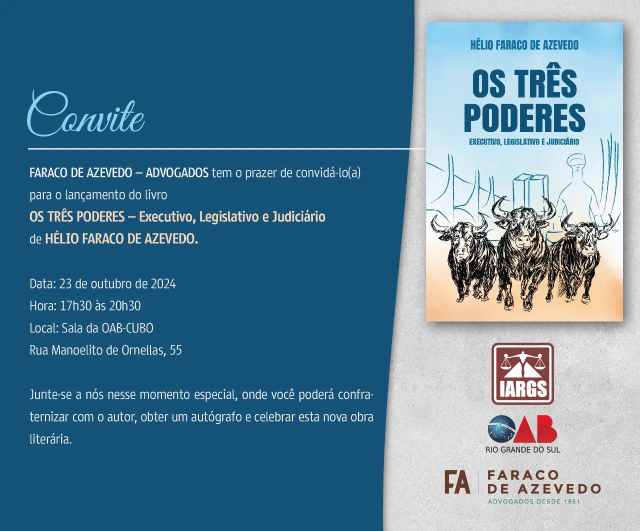 O Decano do IARGS, Dr. Hélio Faraco de Azevedo, lançará seu 10º livro intitulado de “Os Três Poderes: Executivo, Legislativo e Judiciário”, no próximo dia 23/10, a partir das 17h30, na Sala da OAB/Cubo, em Porto Alegre. O escritório Faraco Azevedo Advogados conta, neste evento, com a parceria do IARGS e da OAB/RS . Nesta mesma data estará comemorando seu 96º aniversário, dos quais 73 são dedicados à advocacia. O prefaciador da obra é o Conselheiro-Ouvidor do Tribunal de Contas do RS, Dr. Cezar Miola.