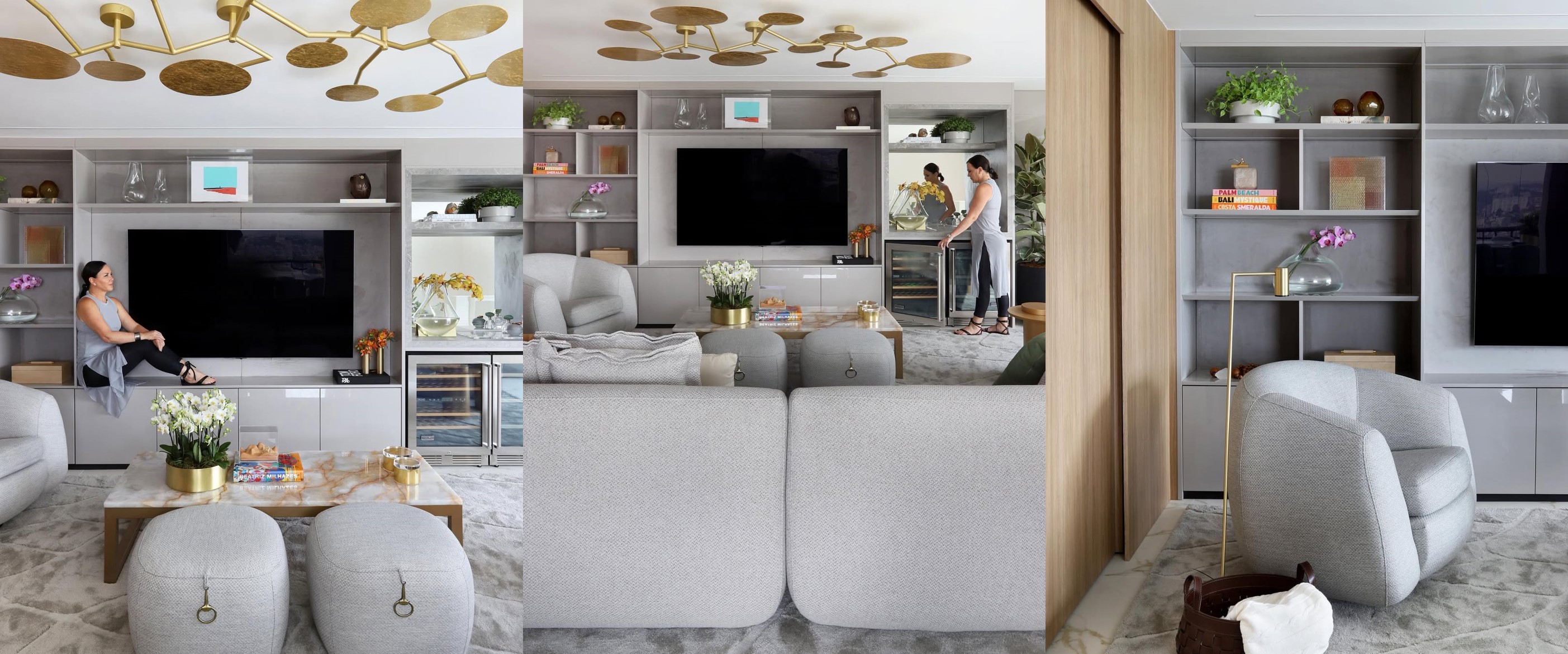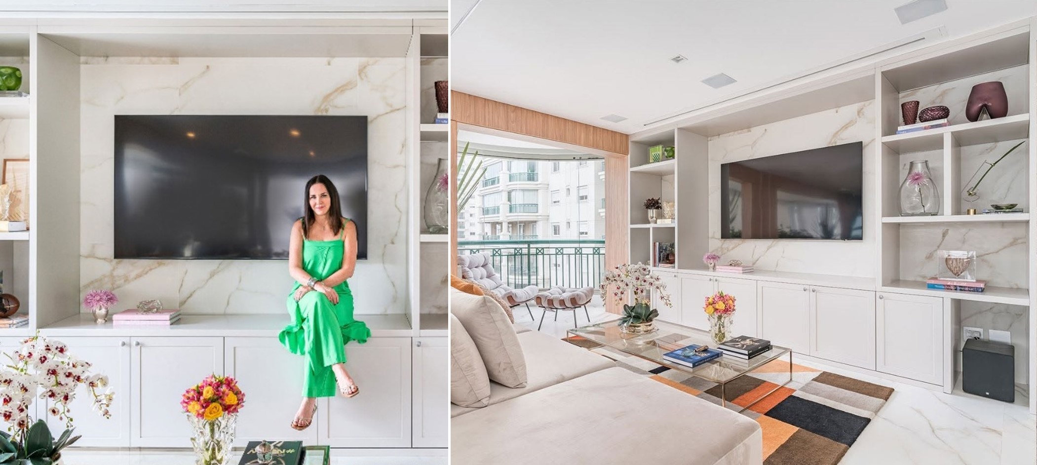 Majestosa, o posicionamento e as dimensões da estante assumem a identidade do living dainfluenciadora Mônica Salgado | Projeto Spaço Interior | Fotos: Edson Ferreira