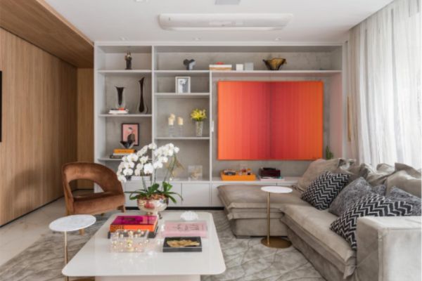 No living da jornalista e influenciadora Mônica Salgado, a arquiteta Ana Rozenblit tirou partido da estruturação dos nichos assimétricos, que compõem a estante, para decorá-la com sua curadoria de objetos decorativos.