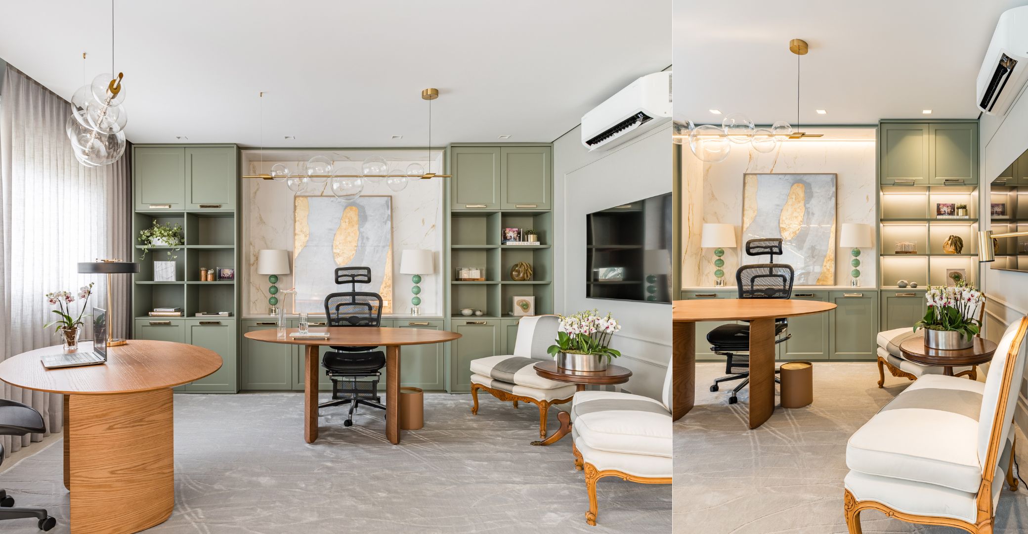 Trabalhar no conforto de casa torna-se ainda mais prazeroso quando se pode desfrutar de um ambiente totalmente dedicado aos aspectos profissionais. Com duas mesas que permitem a companhia um do outro do casal de moradores, a mesa posicionada ao fundo é complementada pela generosa estante projetada por Ana Rozenblit. Na cor verde menta, os armários, com suas portas desenhadas, são perfeitos para manter a organização constante do espaço. Os nichos se tornam mais evidentes com a sutileza da luz de LED embutida.