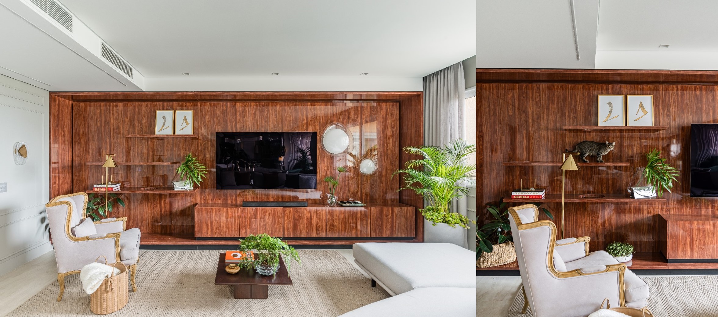 Neste living, a arquiteta Ana Rozenblit explorou o requinte da madeira pau-ferro com brilho, que compõe painel, prateleiras (que os gatinhos amam) e rack. Marcenaria executada pela SCA Jardim Europa| Projeto Spaço Interior | Foto: Kadu Lopes