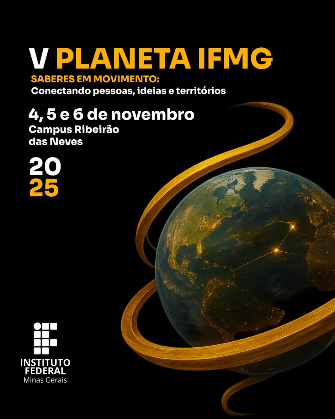 Realizado de forma híbrida e aberto ao público, o Planeta IFMG 2025 terá como tema “Saberes em Movimento: Conectando pessoas, ideias e territórios”. Durante três dias de evento, os estudantes vão apresentar diversas experiências em ensino, pesquisa, extensão, inovação, cultura e esportes. O objetivo é fortalecer o diálogo entre a instituição e a sociedade