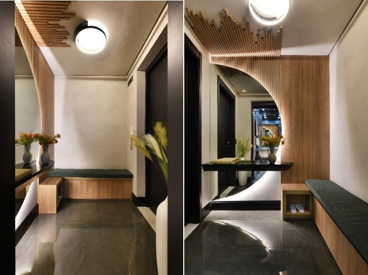 ![]() Em mais um hall que recebe moradores e convidados ao saírem do elevador, por aqui a arquiteta Rosangela Pena conferiu à marcenaria a responsabilidade de produzir um décor despojado e utilitário. Na face onde está o espelho com aparador suspenso, o revestimento acompanha o efeito ripado que, por sua vez, se prolonga pelo desenho formado no teto. Para completar, o banco estofado é um local de espera e apoio para a movimentação com os calçados | FOTOS: Sidney Doll |