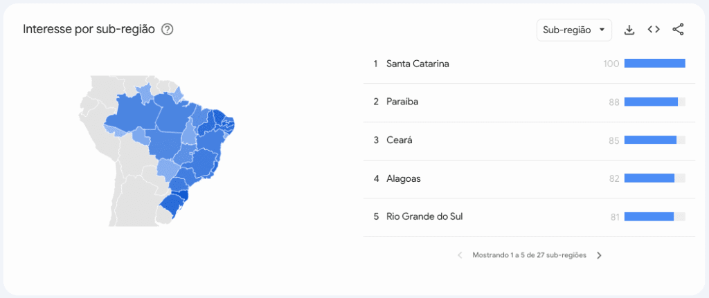 Além do aumento de interesse, a pesquisa revela os estados onde o tema mais chamou atenção: Santa Catarina (100 pontos), Paraíba (88 pontos), Ceará (85 pontos), Alagoas (82 pontos) e Rio Grande do Sul (81 pontos) lideram o ranking de buscas.