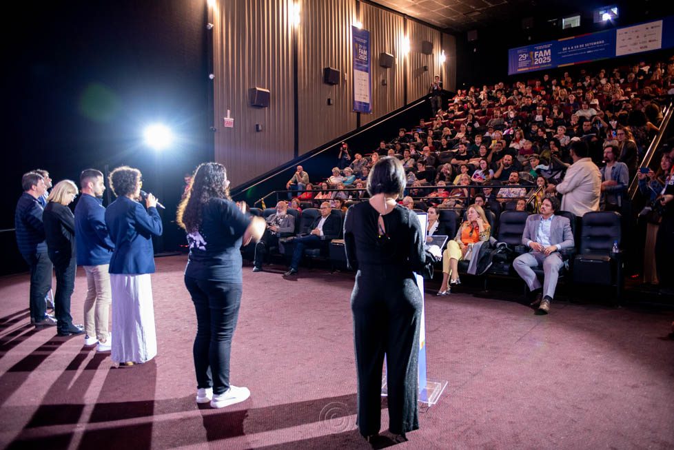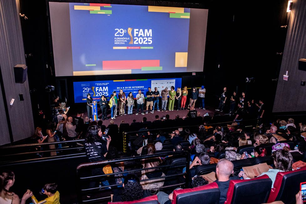 Um dos 10 festivais de cinema mais antigos do Brasil e o maior de Santa Catarina, realizado pela Associação Cultural Panvision, o 29º Festival Internacional de Cinema Florianópolis Audiovisual Mercosul – FAM 2025, iniciou nesta quinta-feira (5) com sala lotada no Cine Show do Beiramar Shopping, numa cerimônia acolhedora para o público neurodivergente. As palmas foram substituídas por acenos de mãos e todo o evento teve a presença de uma intérprete de Libras.