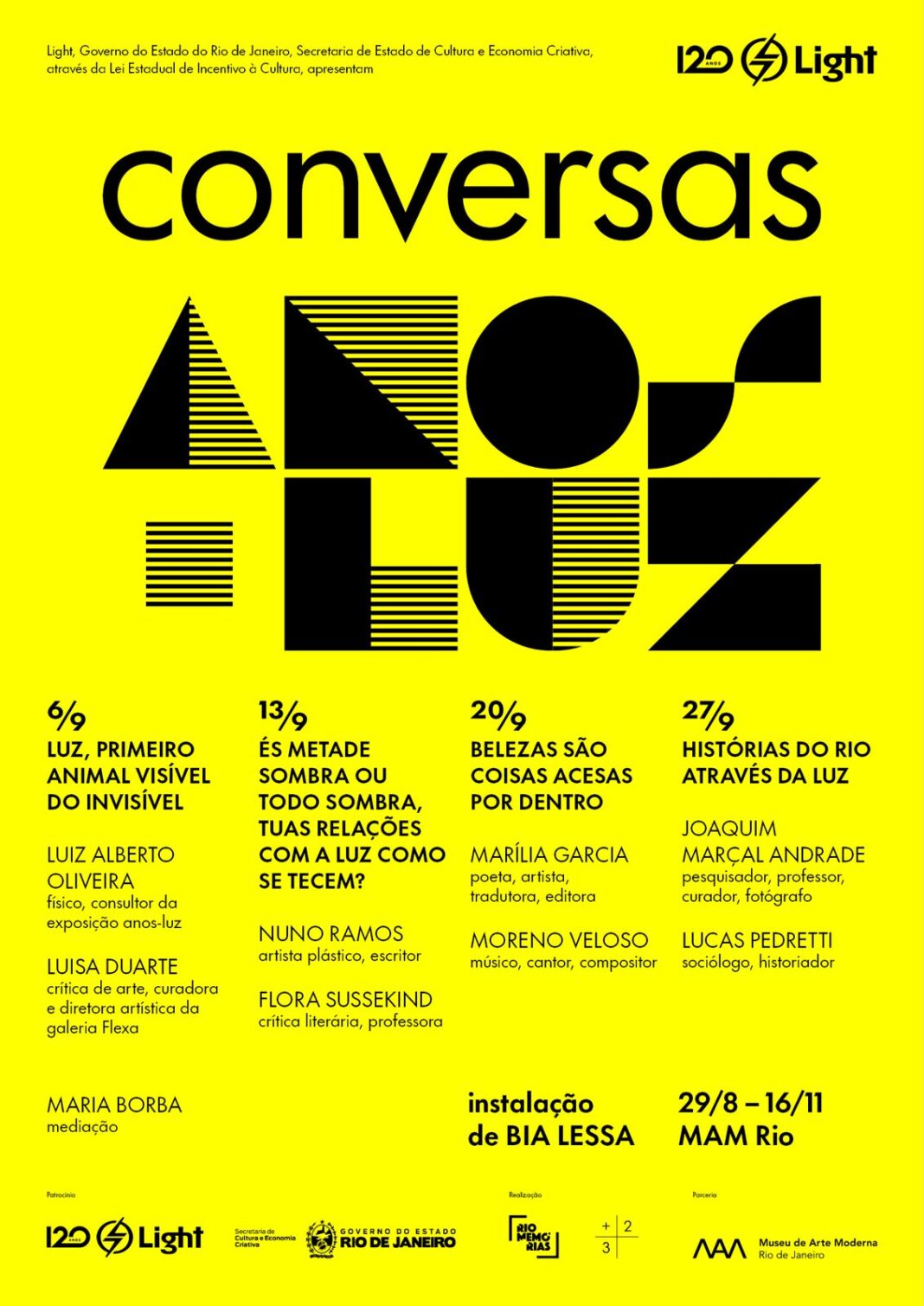 O projeto celebra os 120 anos da Light, patrocinadora da iniciativa, e propõe uma imersão sensorial no espaço expositivo do museu. A cada sábado, uma dupla de convidados, entre poetas, cientistas, músicos, escritores e artistas visuais, se reúne para discutir os cruzamentos entre luz e sombra, espaço e tempo, a partir de distintas áreas do conhecimento e da criação.