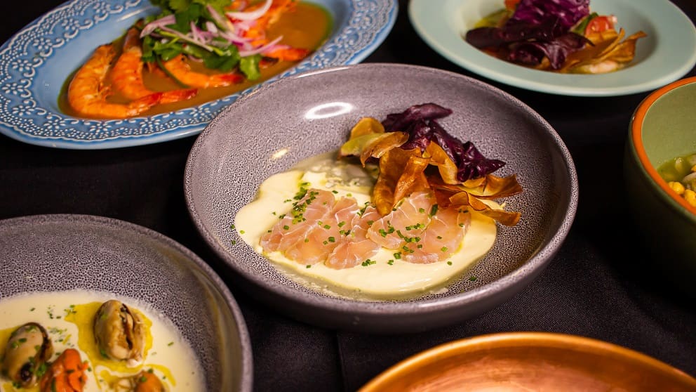 Logo após, no salão está a disposição um buffet completo com uma mesa de pratos frios, como Ceviche Clássico Peruano, Salada de Lulas Nacional com Manga,