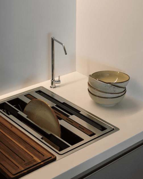 Já as calhas secas funcionam como canaletas multifuncionais para apoiar utensílios e temperos. “A sua durabilidade é extensa, pois são de aço inox, mesmo material das cubas“, assegura o arquiteto. “Sem contar que podemos dispô-las tanto na lateral, como na frente da torneira e em diferentes tamanhos e modelos. Tudo vai depender do espaço disponível”, complementa.