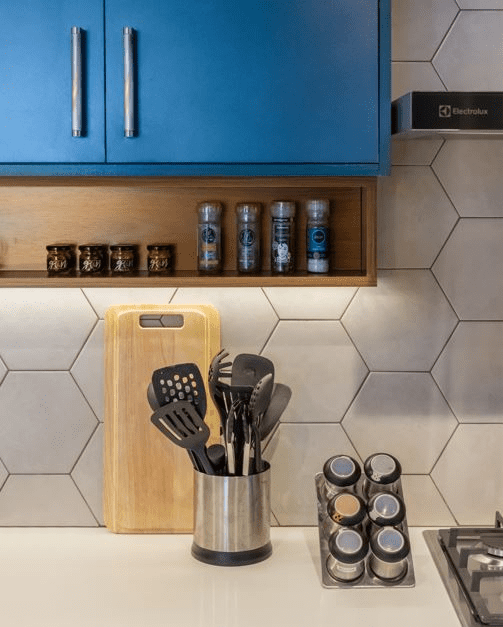 Nessa cozinha, o LED projetado dá destaque ao revestimento hexagonal, além de iluminar com maior precisão a bancada | Projeto BMA Studio | Foto: Guilherme Pucci