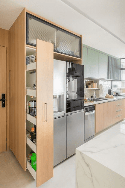 Na lateral da geladeira, seria pouco provável considerar a viabilidade de uma despensa com a capacidade dessa elaborada pelo arquiteto Bruno Moraes | Projeto BMA Studio | Foto: Guilherme Pucci