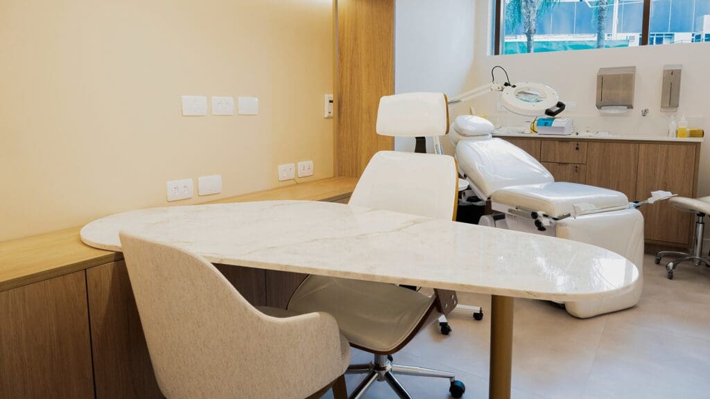 Projeto une arquitetura de excelência e marcenaria personalizada para criar ambientes clínicos elegantes e funcionais