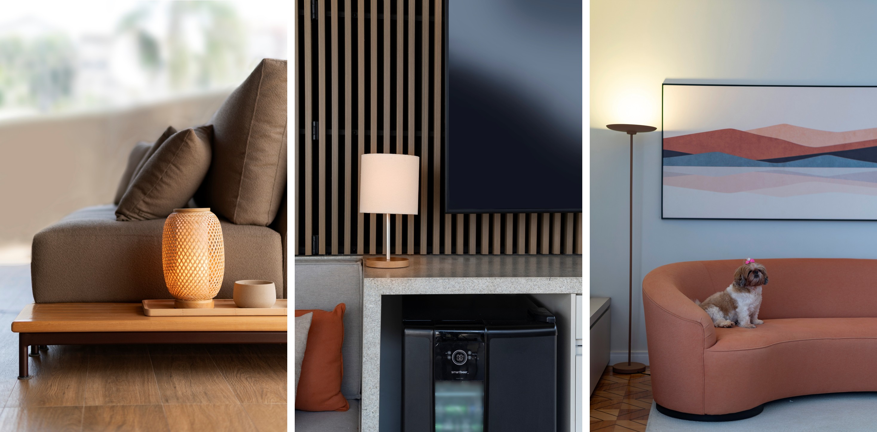 | Exemplos de artigos de iluminação disponíveis na Yamamura (luminárias de mesa e piso) que podem integrar a Sala de TV / Projeto de Degradê Arquitetura e fotos de Emerson Rodrigues |
