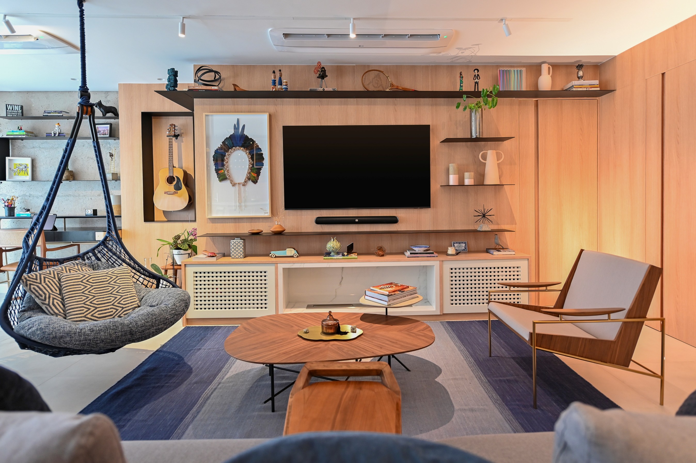 | Sala de TV idealizada pelo escritório BMA Studio, que apresenta luzes agradáveis / Foto de Emerson Rodrigues |