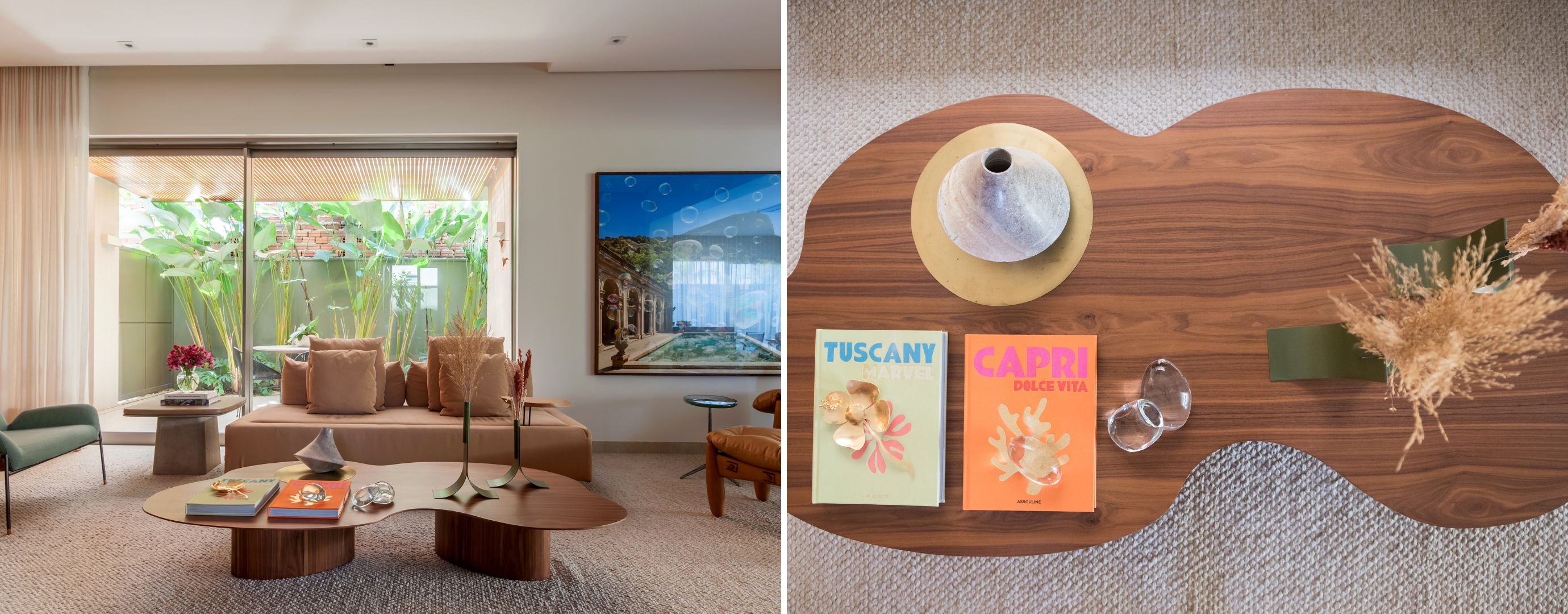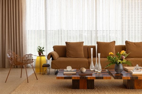 As especialistas salientam que ficou para trás a ideia do ‘parzinho combinadinho’. Isto é, mesa de centro não precisa seguir referências e dimensões semelhantes. “Particularmente, vemos muita beleza nesses arranjos que se tornam exclusivos autorais“, contam.