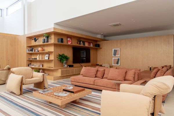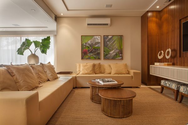 Neste living, a mesa de centro Litoral, de autoria de Jacqueline Terpins, traz a madeira folha paradentro da casa e remonta aos pilares modernistas encontrados em regiões litorâneas do Brasil |Projeto Paiva e Passarini Arquitetura e Interiores | Fotos: Xavier Neto