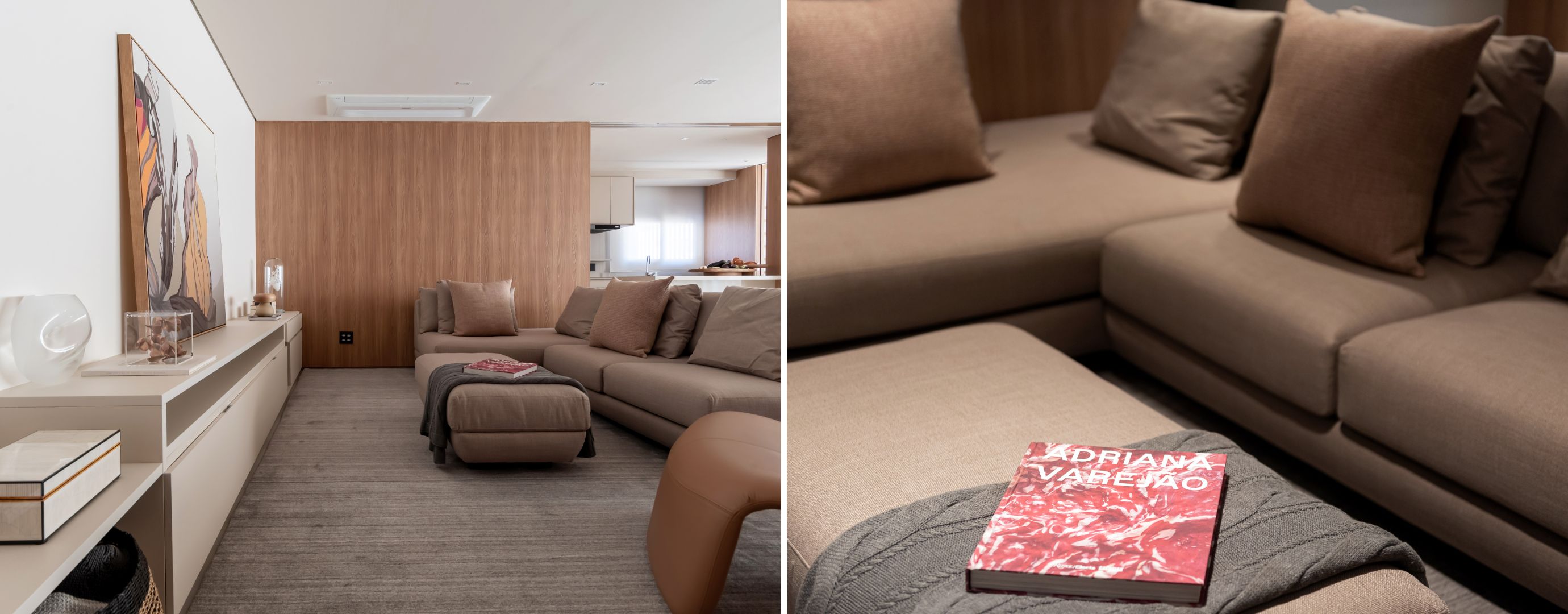 A mesa de centro pode ser substituída? Acompanhando as características do sofá, o pufe designado pelas profissionais cumprem o seu papelprincipal, como a parte prática do apoio de uma mesa de centro | Projeto Paiva e PassariniArquitetura e Design | Foto: Xavier Neto