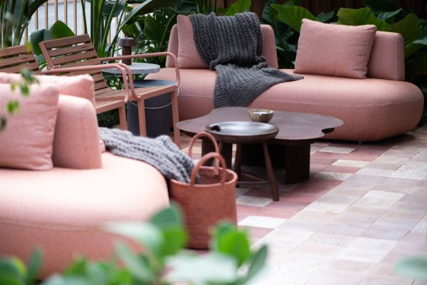 E se o par da mesa de centro não for, necessariamente uma outra mesa? Nessa área externa, o banco Mocho,de Sergio Rodrigues, com a madeira maciça de jacarandá, acompanha a tonalidade da peça principal, executadaem aço corten | Projeto Paiva e Passarini Arquitetura e Interiores | Foto: Xavier Neto