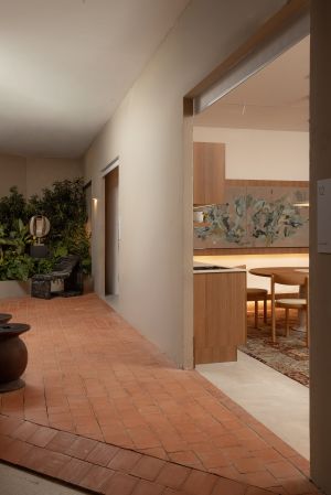 O Invecchiatto Verona 15×15 reveste o piso instalado em uma área que separa o ambiente de Claudia Infante do Loft do Homem 50+ (ao lado) e representa um respiro entre eles. O verde foi contemplado com o jardim criado por Ana Veras, destacando a paleta de cores suaves e revestimentos naturais e artesanais, que celebram a brasilidade.