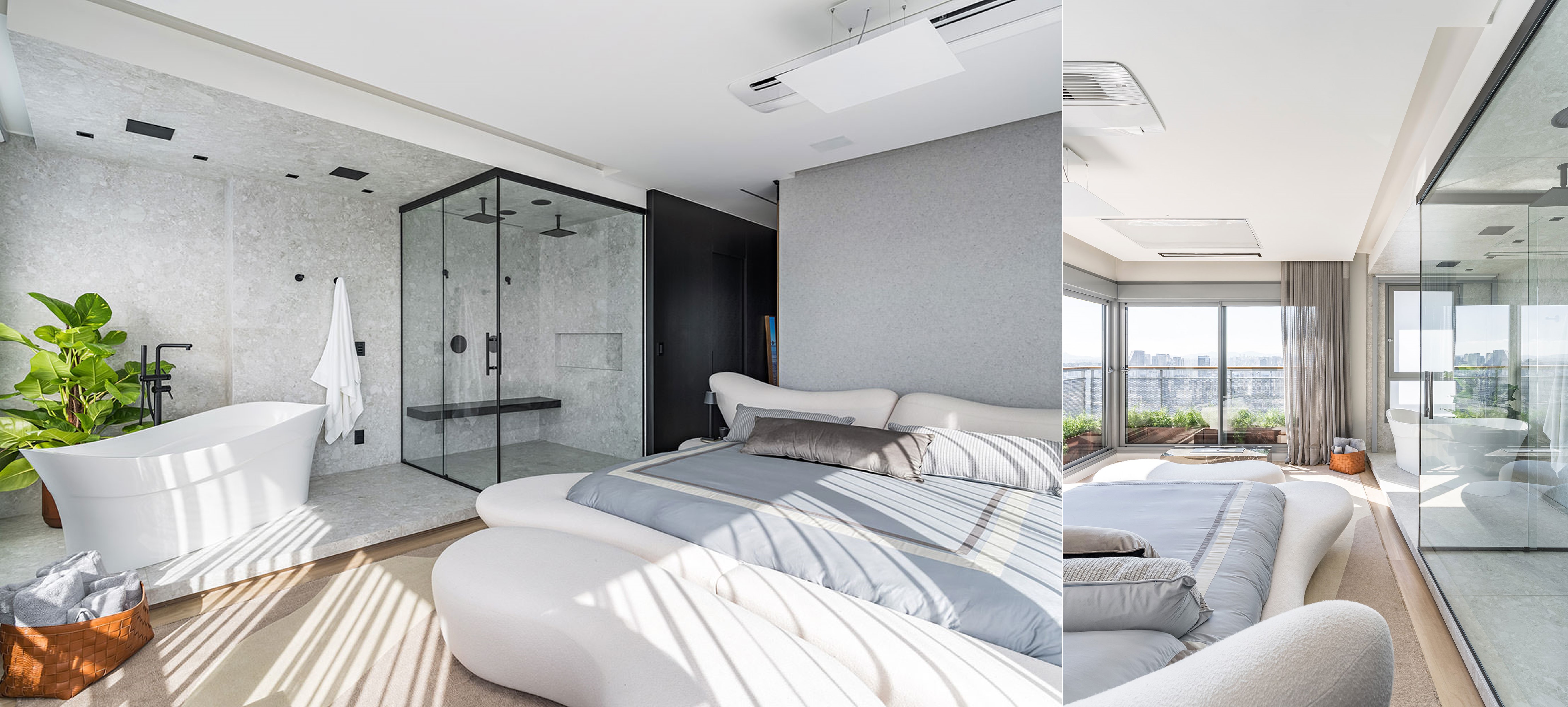 Diretamente do 47º andar de um suntuoso prédio de São Paulo, com vista para a Ponte Estaiada, um dos cartões-postais da cidade, ela combinou banheira de imersão e um generoso box ao lado da cama. “Com a serralheria até o teto, o morador tem um clima de sauna em casa“, acrescenta a profissional.