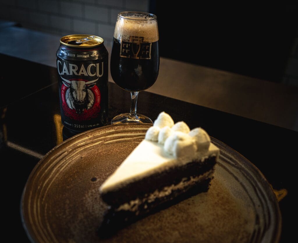 Bolos de chocolate harmonizam muito bem com cervejas do estilo Porter e Stout. Neste caso, a sobremesa é harmonizada com Caracu, cerveja alcoólica da Ambev, conhecida pela cor preta intensa e aromas de malte torrado e café.