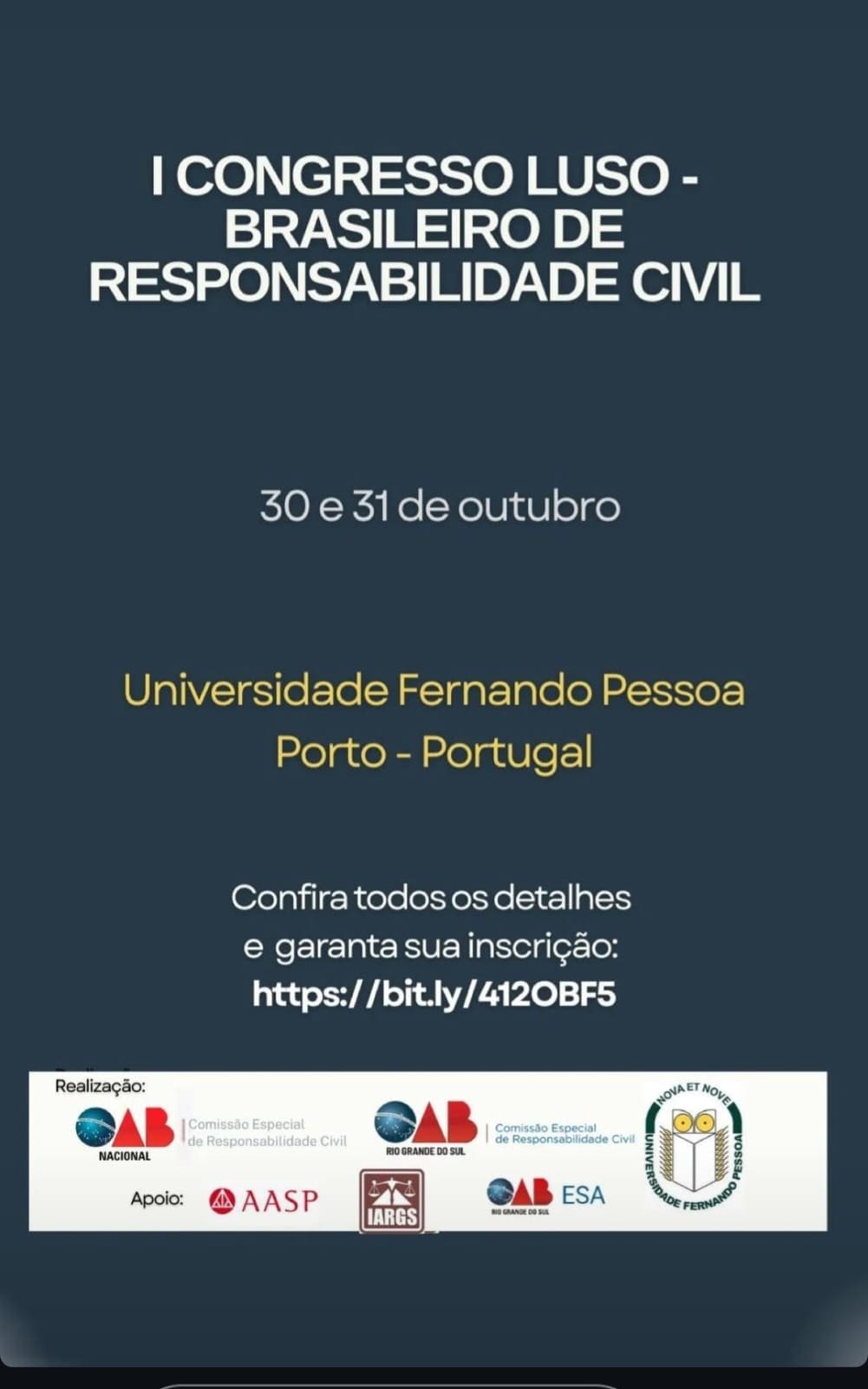 A Universidade Fernando Pessoa (UFP), no Porto (Portugal), sediará nos próximos dias 30 e 31 de outubro, o I Congresso Luso-Brasileiro de Responsabilidade Civil. O evento é promovido em parceria entre a Ordem dos Advogados do Brasil – Seção Rio Grande do Sul (OAB/RS), por meio da Comissão Especial de Responsabilidade Civil, a OAB Nacional, o Instituto dos Advogados do Rio Grande do Sul (IARGS) e instituições portuguesas.