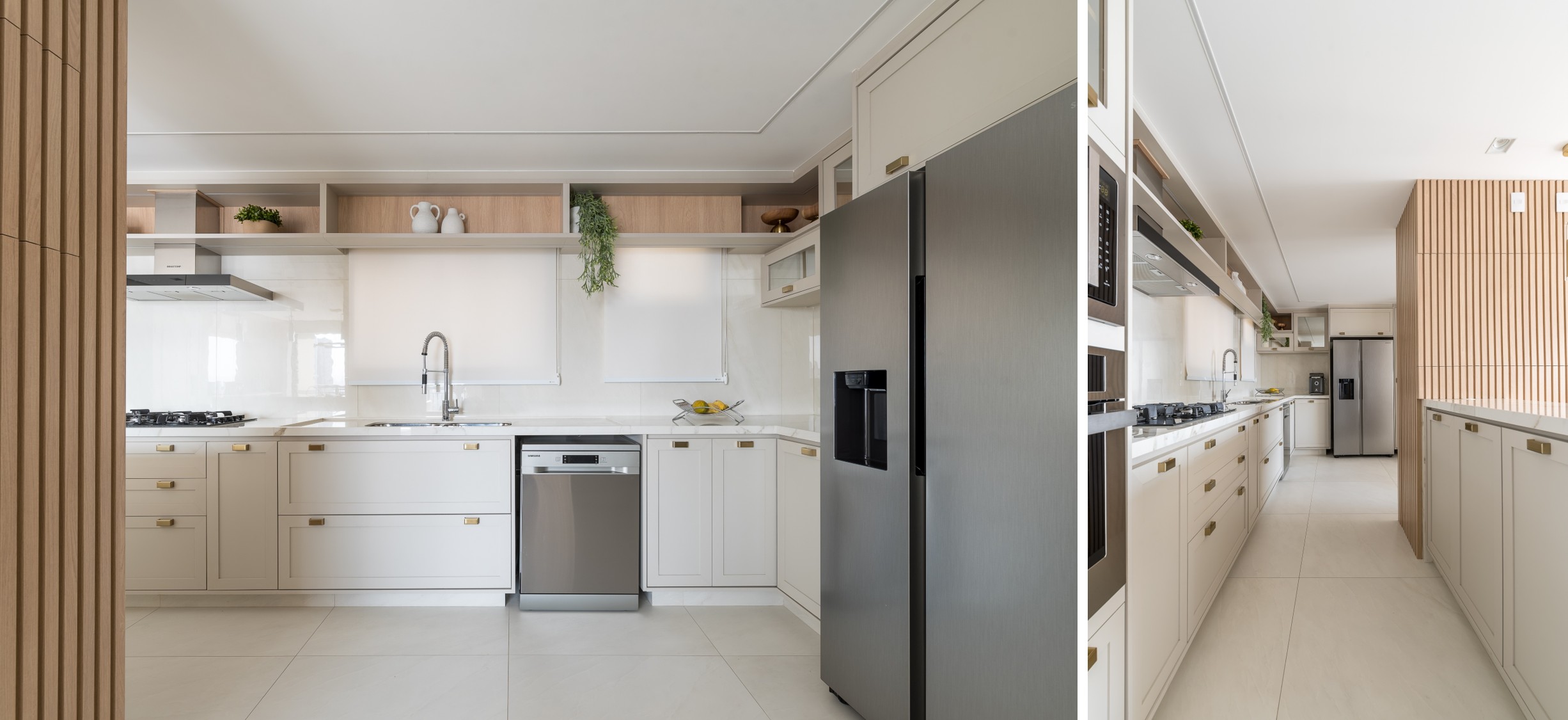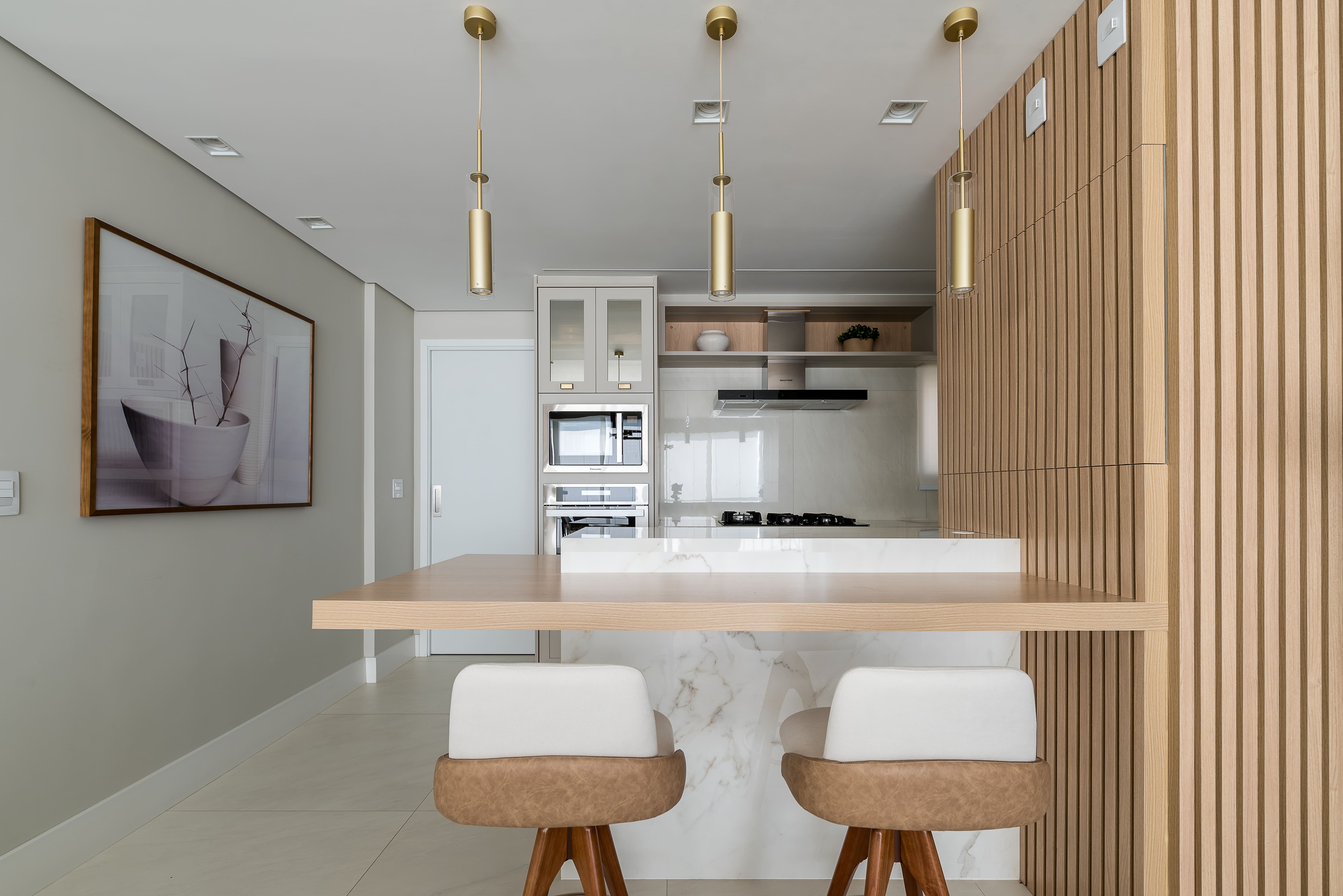 | Inspirada pelo estilo provençal, Cinthia revisita um clássico da arquitetura na cozinha: os armários com portas ‘almofadadas’. Quase todos os detalhes de serralheria do projeto possuem um tom dourado, como nos puxadores da marcenaria, resultando em um ambiente chique e refinado. A ilha em lâminas de calacata delimita o espaço, enquanto a pilastra estrutural do edifício guarda o quadro de distribuição de todo o apartamento, que foi camuflado pelo painel ripado de MDF. “Transformamos um elemento técnico em recurso de aconchego, garantindo funcionalidade e estética”, avalia a profissional. |