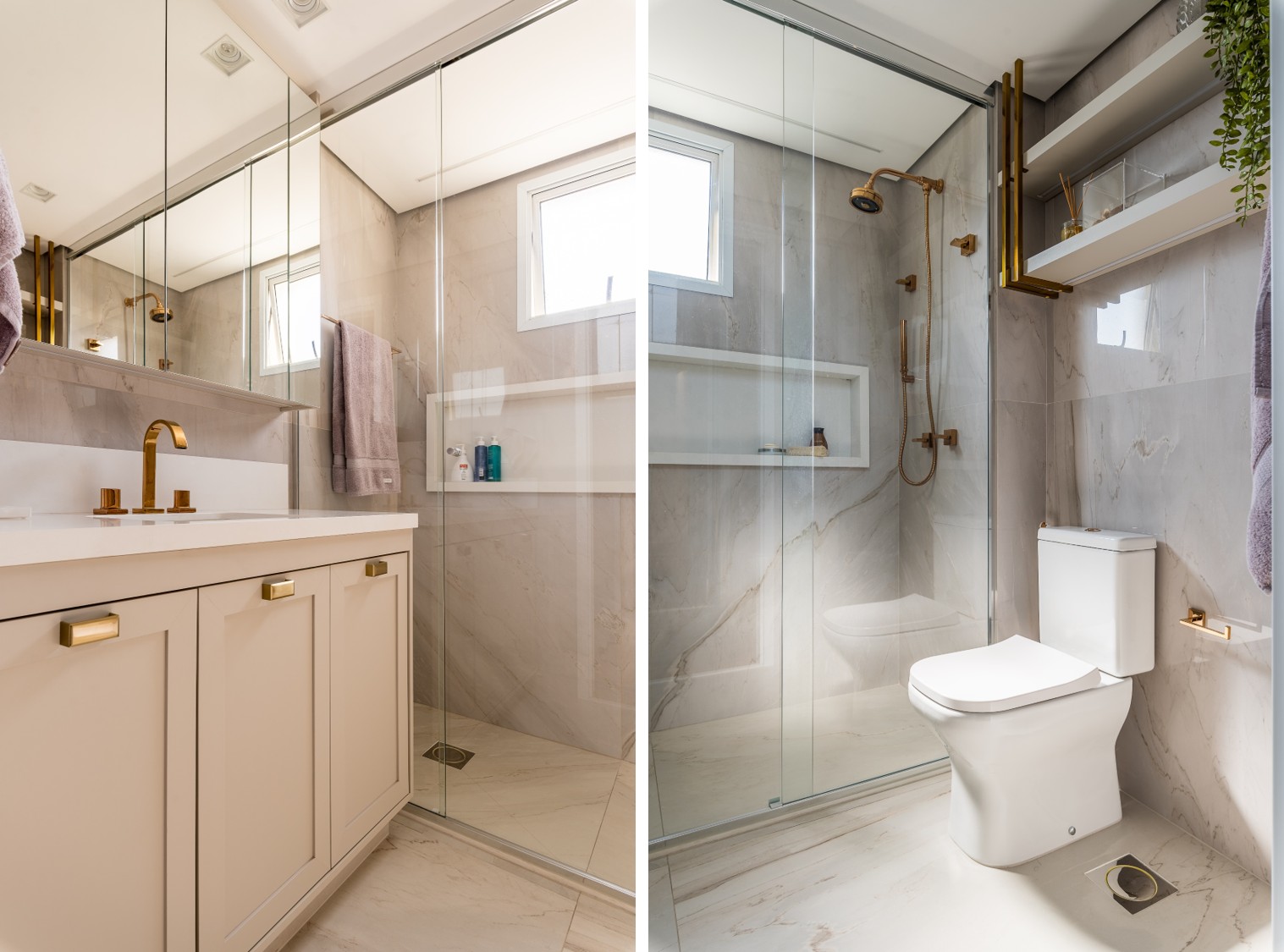 | Para o banheiro, o porcelanato polido das paredes eleva o toque de elegância, que é arrematado pelos metais dourados presentes até mesmo no chuveiro | Projeto: Cinthia Claro Arquitetura | Fotos: Erika Waldmann |