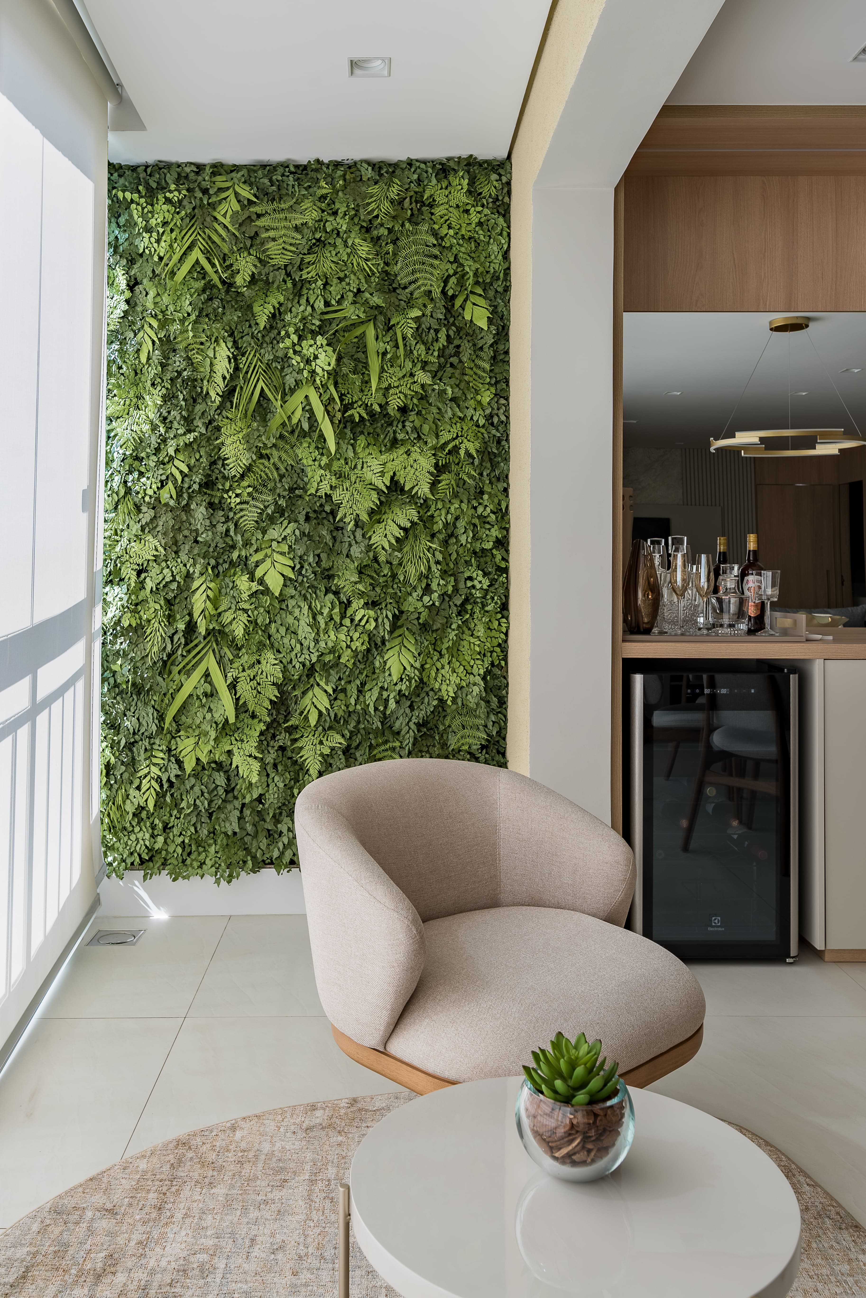 | A varanda recebeu um cantinho do vinho que é emoldurado pelo jardim vertical, feito de plantas preservadas | Projeto: Cinthia Claro Arquitetura | Foto: Erika Waldmann |