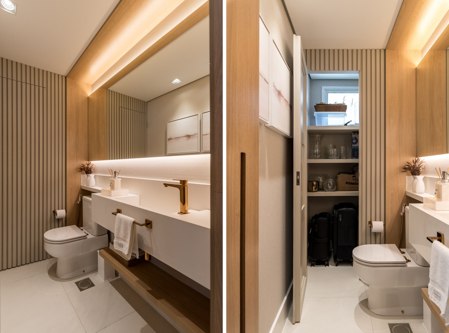| A mesma linguagem da área social foi adotada no lavabo, explorando novamente painéis ripados de MDF de Carvalho, metais dourados e iluminação difusa (Yamamura) | Projeto: Cinthia Claro Arquitetura | Fotos: Erika Waldmann |