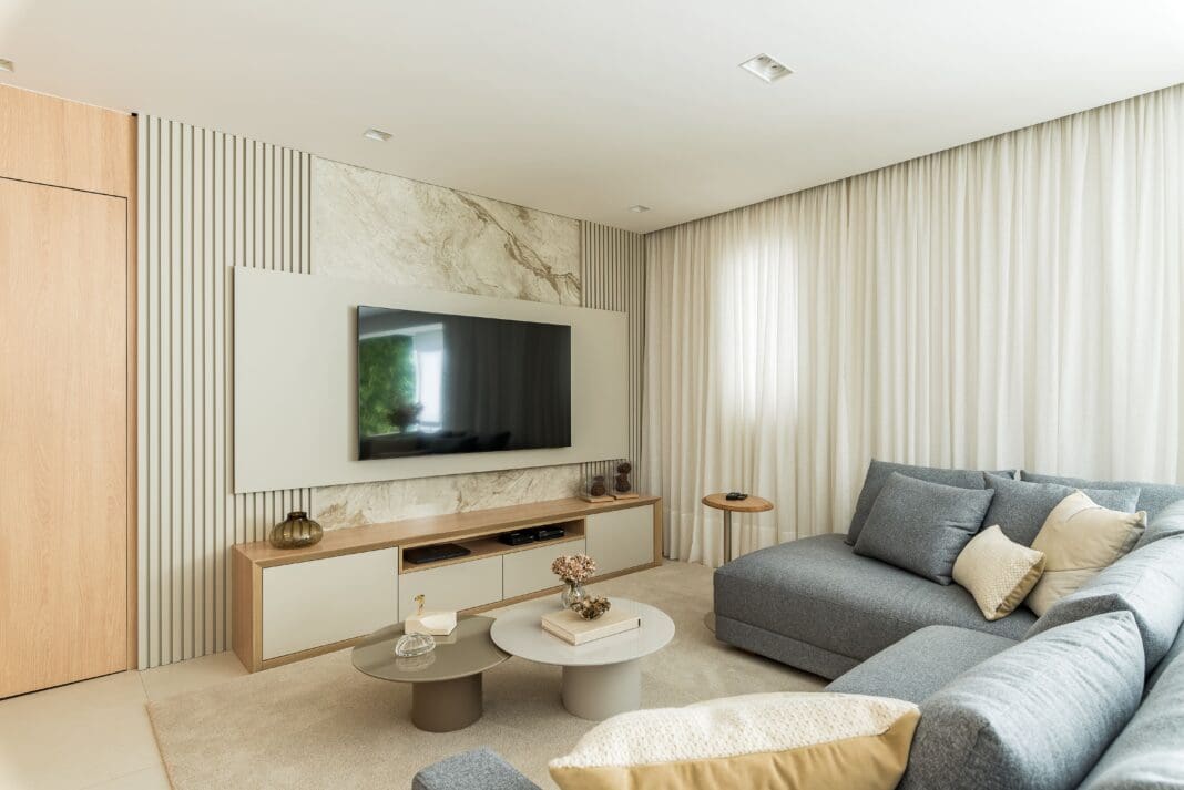 | Após 15 anos sem intervenções, um apartamento de 150 m² na Vila Romana, em São Paulo, ganhou nova vida pelas mãos da arquiteta Cinthia Claro, que reformulou completamente o espaço para atender às necessidades de sua cliente, uma mulher independente e bem-sucedida que vive sozinha. A moradora não quis abrir mão de seu lar, mas sim transformá-lo em um cenário alinhado à sua rotina atual, cheio de conforto e praticidade. “Foi um desafio instigante, especialmente pela reformulação da planta. Todas as paredes originais, feitas em drywall, foram demolidas e reconstruídas com manta de isolamento acústico, um dos desejos da cliente”, explica Cinthia, que à frente de seu escritório homônimo, comandou a obra ao longo de oito meses. Além da troca de revestimentos e da renovação total do mobiliário – com os móveis antigos destinados à doação –, a reforma incluiu mudanças profundas na configuração dos espaços. A cozinha e a área de serviço, por exemplo, foram invertidas de posição. “A cliente não queria cozinhar em um local separado, mas estar em um ambiente onde pudesse partilhar deste momento junto dos amigos e familiares. Por isso, abrimos o ambiente e valorizamos a integração”, completa a arquiteta. Living acolhedor |