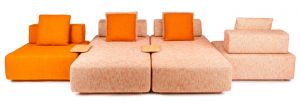 O Sofá Mondrian é um verdadeiro retrato de versatilidade. Composto por módulos personalizáveis, permite inúmeras configurações para se adaptar a diferentes espaços e ocasiões. Sua estrutura em aço com pinturas especiais que garantem resistência e durabilidade, enquanto o revestimento em tecido de alta performance reforça a praticidade. A peça se destaca ainda pela flexibilidade: pode receber puffs, chaises, assentos adicionais e até mesas laterais que funcionam tanto como apoio de trabalho quanto como mesa auxiliar. Um puff integra o conjunto, acomodando até três pessoas ou servindo como apoio para refeições rápidas, reunindo funcionalidade e sofisticação em um único mobiliário.