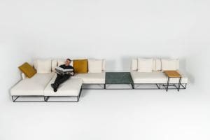 O Sofá Mondrian é um verdadeiro retrato de versatilidade. Composto por módulos personalizáveis, permite inúmeras configurações para se adaptar a diferentes espaços e ocasiões. Sua estrutura em aço com pinturas especiais que garantem resistência e durabilidade, enquanto o revestimento em tecido de alta performance reforça a praticidade. A peça se destaca ainda pela flexibilidade: pode receber puffs, chaises, assentos adicionais e até mesas laterais que funcionam tanto como apoio de trabalho quanto como mesa auxiliar. Um puff integra o conjunto, acomodando até três pessoas ou servindo como apoio para refeições rápidas, reunindo funcionalidade e sofisticação em um único mobiliário.