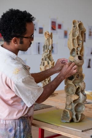 Com espaços em São Paulo, Curitiba e Balneário Camboriú, a Simões de Assis tem ampliado sua atuação internacional com projetos consistentes e alinhados às urgências do presente. A escolha por Diambe reafirma esse compromisso. Nascida em 1993 no Rio de Janeiro e atualmente radicada em São Paulo, a artista — pessoa negra e não binária — desenvolve uma poética que articula escultura, coreografia, performance, pintura e vídeo, em obras que propõem a emergência de novos corpos e ambientes. Seu trabalho, atravessado por saberes diaspóricos, explora matérias vivas como tecidos, raízes alimentares e elementos vegetais, muitas vezes mimetizados em formas fabulatórias que tensionam a hierarquia entre natureza e humanidade.