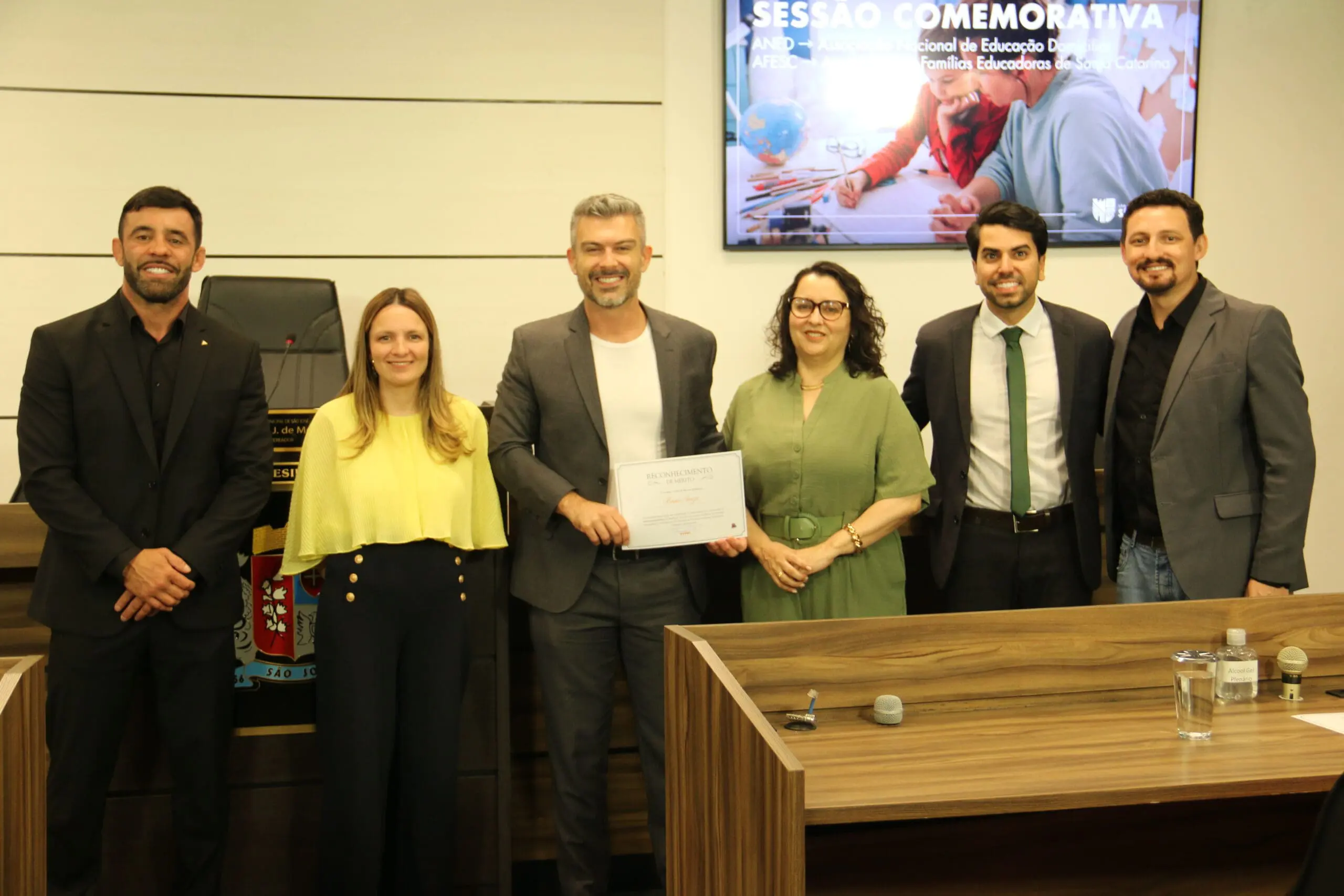 Autor do Projeto de Lei que regulamentou o ensino domiciliar no Estado, o ex-deputado estadual Bruno Souza (2019-2022), foi homenageado durante a Sessão Comemorativa realizada pela Câmara Municipal de São José. A cerimônia, realizada nesta semana (11.11), foi proposta pelo vereador Cryslan Jorjan de Moraes (NOVO), em alusão aos 15 anos da Associação Nacional de Educação Domiciliar (ANED) e aos 6 anos da Associação de Famílias Educadoras de Santa Catarina (AFESC).
