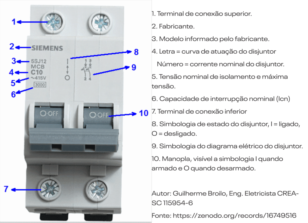Ao visualizarmos um disjuntor instalado conseguimos observar algumas informações importantes, conforme a imagem abaixo, temos:
