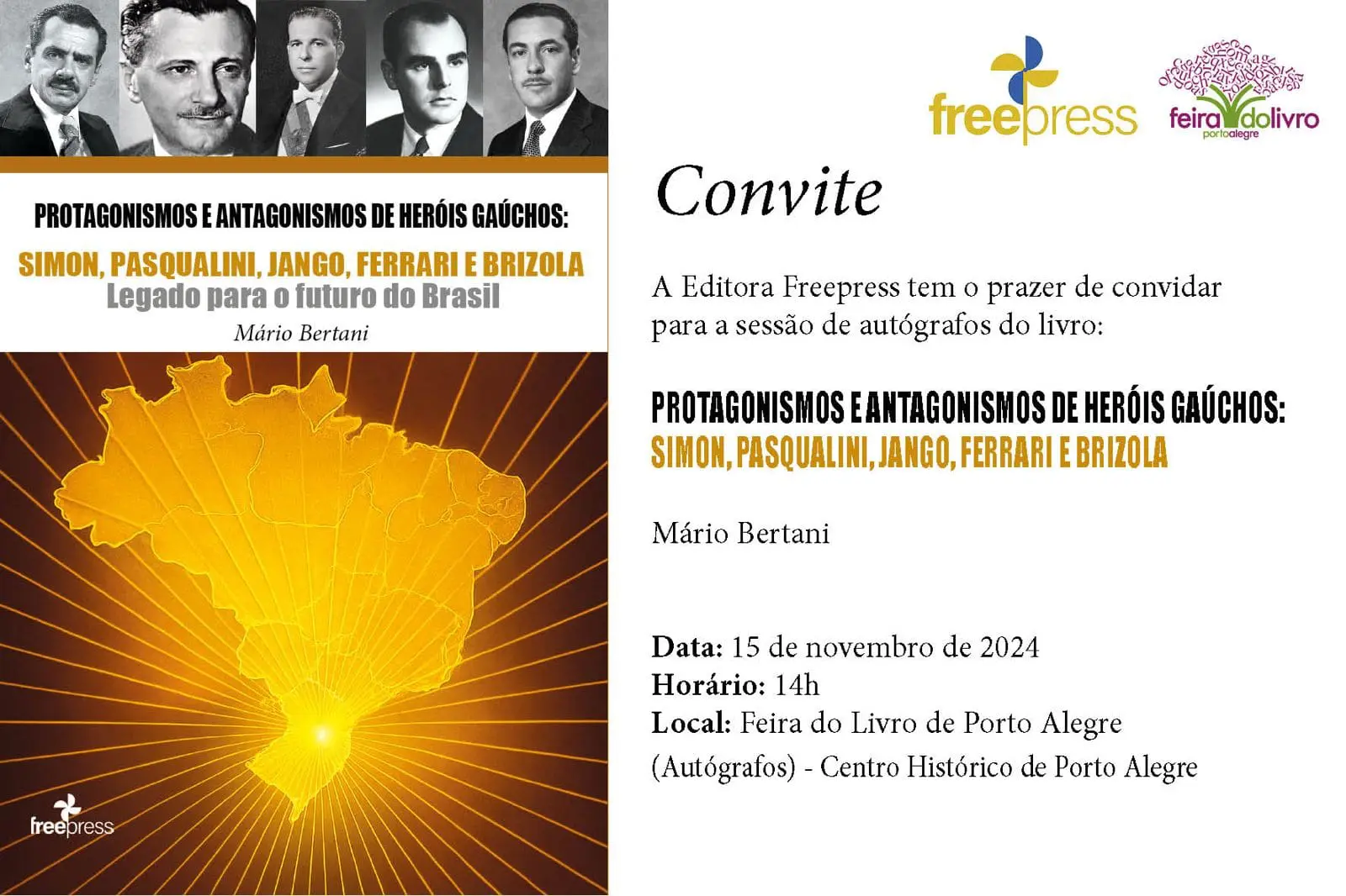 O escritor Mário Bertani lança, no dia 15 de novembro, às 14h, durante a sessão coletiva de autógrafos da 71ª Feira do Livro de Porto Alegre, a obra “Protagonismos e Antagonismos de Heróis Gaúchos: Simon, Pasqualini, Jango, Ferrari e Brizola – Legado para salvar o Brasil do abismo”.