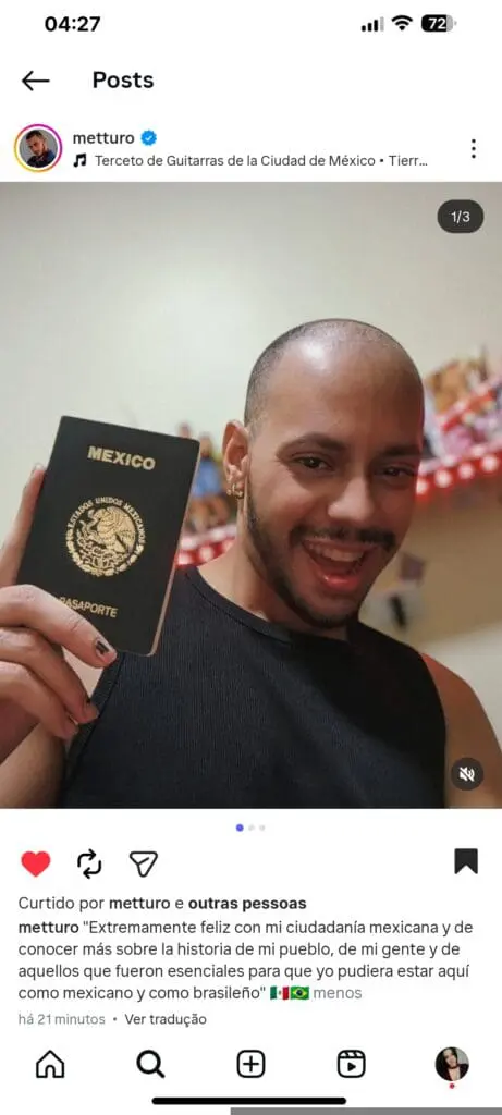 “Estou extremamente feliz com minha cidadania mexicana e de poder conhecer mais sobre a história do meu povo, da minha gente e daqueles que foram essenciais para que eu pudesse estar aqui como mexicano e como brasileiro, amo minha ascendência” – Agradeceu o artista em legenda do post publicado, após lutas judiciais para provar ser um cidadão mexicano.