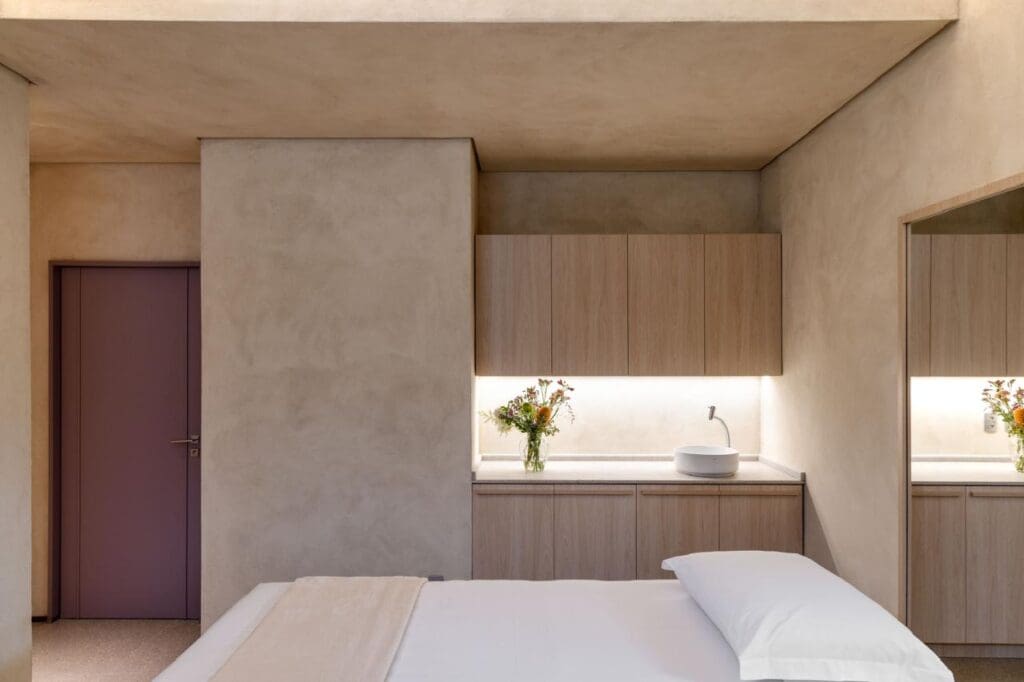Além da loja, o projeto incorporou o SPA “Brapandi”, pensado como um refúgio no meio da cidade. “Queríamos despertar a autonomia na loja e, no SPA, proporcionar o oposto: um espaço de quietude e relaxamento. Por isso trabalhamos com menos estímulos e uma iluminação intimista, criando um ambiente de calma e presença”, afirma Leliano. A antessala, com papel de parede de nuvens e o som de uma fonte, reforça essa atmosfera de oásis.