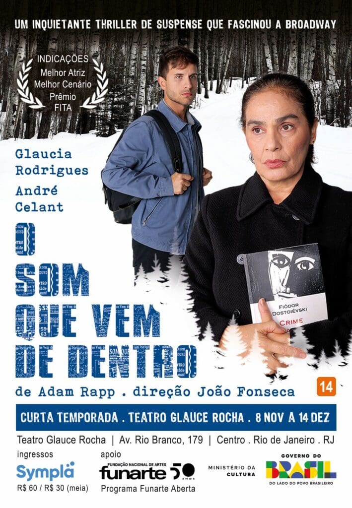 Primeira montagem no Brasilda peça The Sound Inside, de Adam Rapp, O Som que Vem de Dentro está de volta aos palcos em curta temporada no Teatro Glauce Rocha, no Centro do Rio, de 08 de novembro a 14 de dezembro. Sob a direção de João Fonseca e tradução de Clara Carvalho, o espetáculo, aclamado mundialmente e sucesso na Broadway, traz aos palcos brasileiros uma trama de suspense intensa e cheia de nuances, uma imersão no universo de dois personagens que, mesmo distintos, se encontram na fragilidade humana diante da vida e da morte. As sessões em novembro acontecem de quinta a sábado, às 19h, e domingo, às 18h. Em dezembro, sexta e sábado, às 19h, e domingo, às 18h.