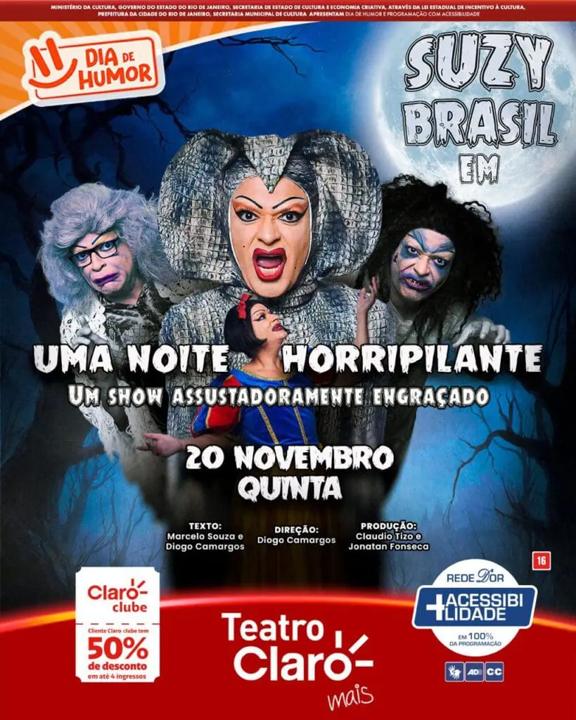 Suzy Brasil e seu criador Marcelo Souza estão de volta com um novo espetáculo, trazendo alguns personagens inéditos e outros já conhecidos do público tanto no humorístico LOL – Se rir já era, da Amazon Prime, no qual Suzy foi vice-campeã da terceira temporada do programa em 2023, como também da internet. “Uma Noite Horripilante” estreia no Teatro Claro Mais RJ, em Copacabana, no dia 20 de novembro, quinta-feira, às 20h.